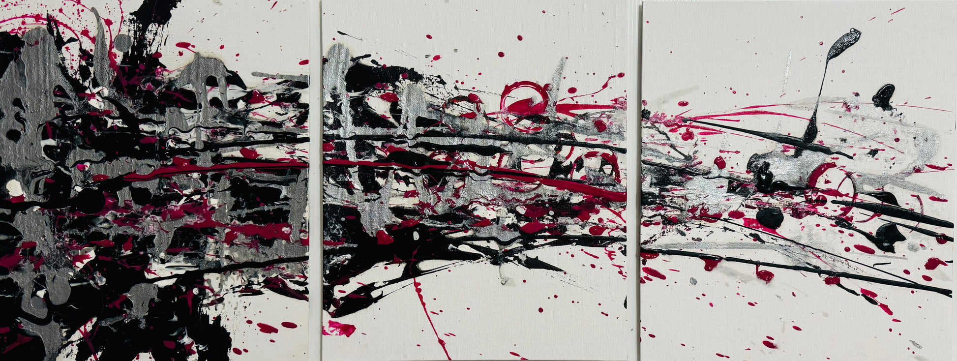 Take a leap into a world of art and colour with Silica Splash! The bold trio of 10" x 12" paintings spark creativity and challenge the eye with silver, black and pink hues. Be daring and make a statement with this unique artwork!